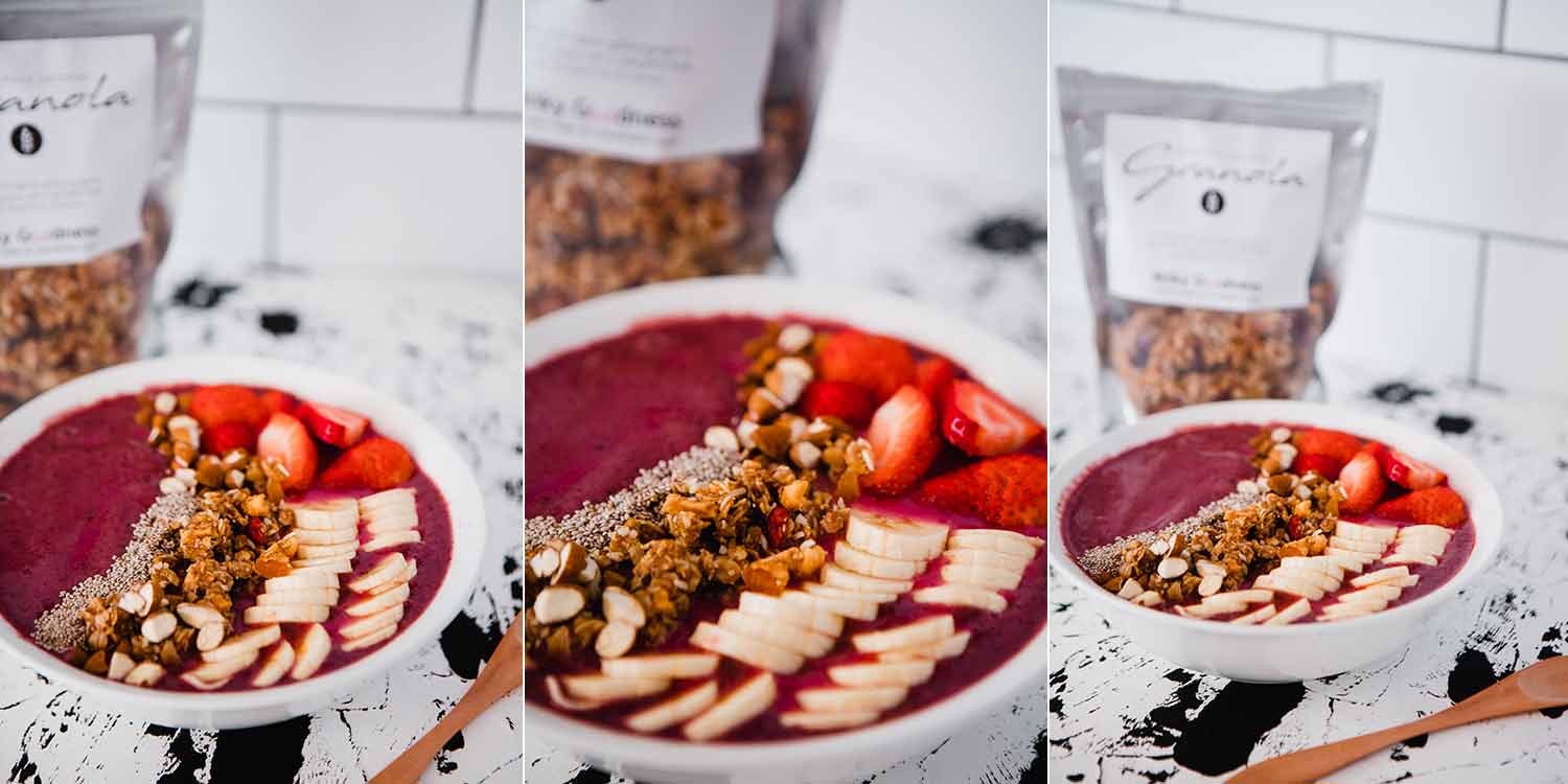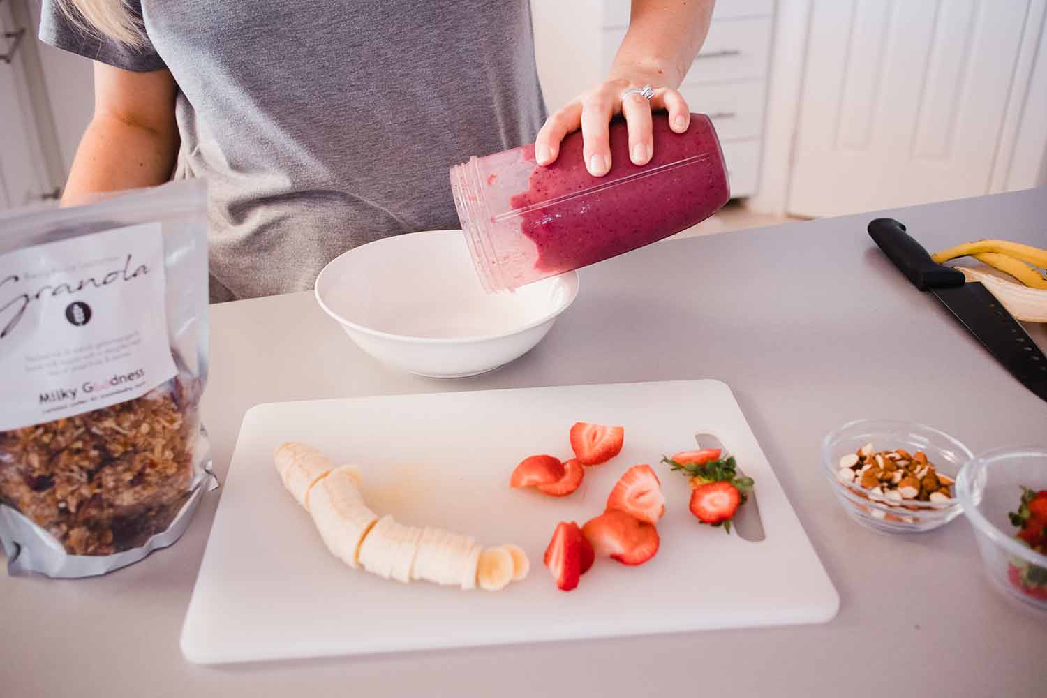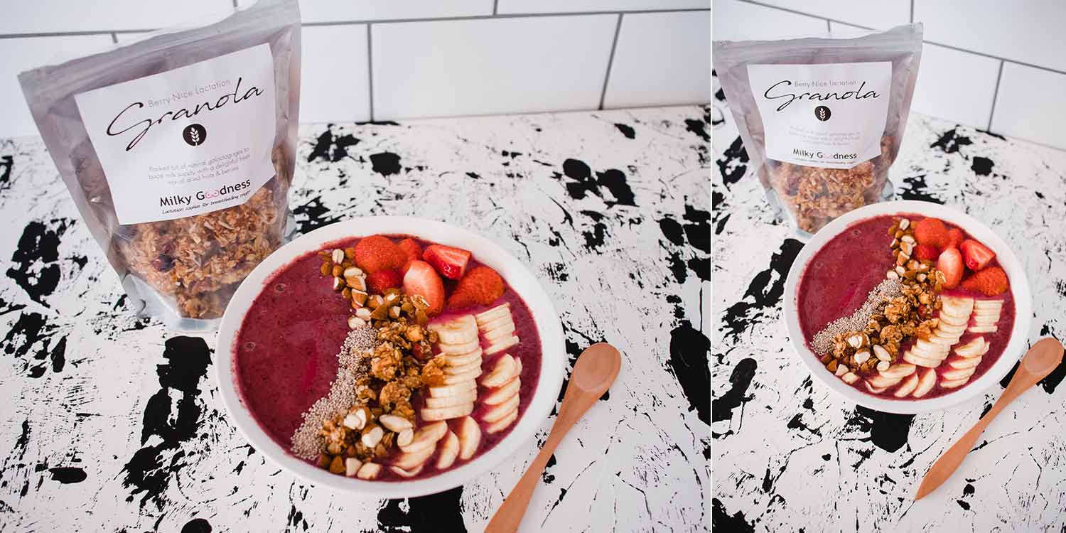 Now, I have been trying to eat less dairy (dairy isn’t super ideal when breastfeeding, because it can cause bubs to have an upset tummy), so mixing this granola into my usual big bowl of yoghurt was no longer an option. So I decided to make a berry smoothie bowl! It’s been ages since I made one of these, and oh my (milky) goodness, it was AMAZE – see what I did there; hahaha.
